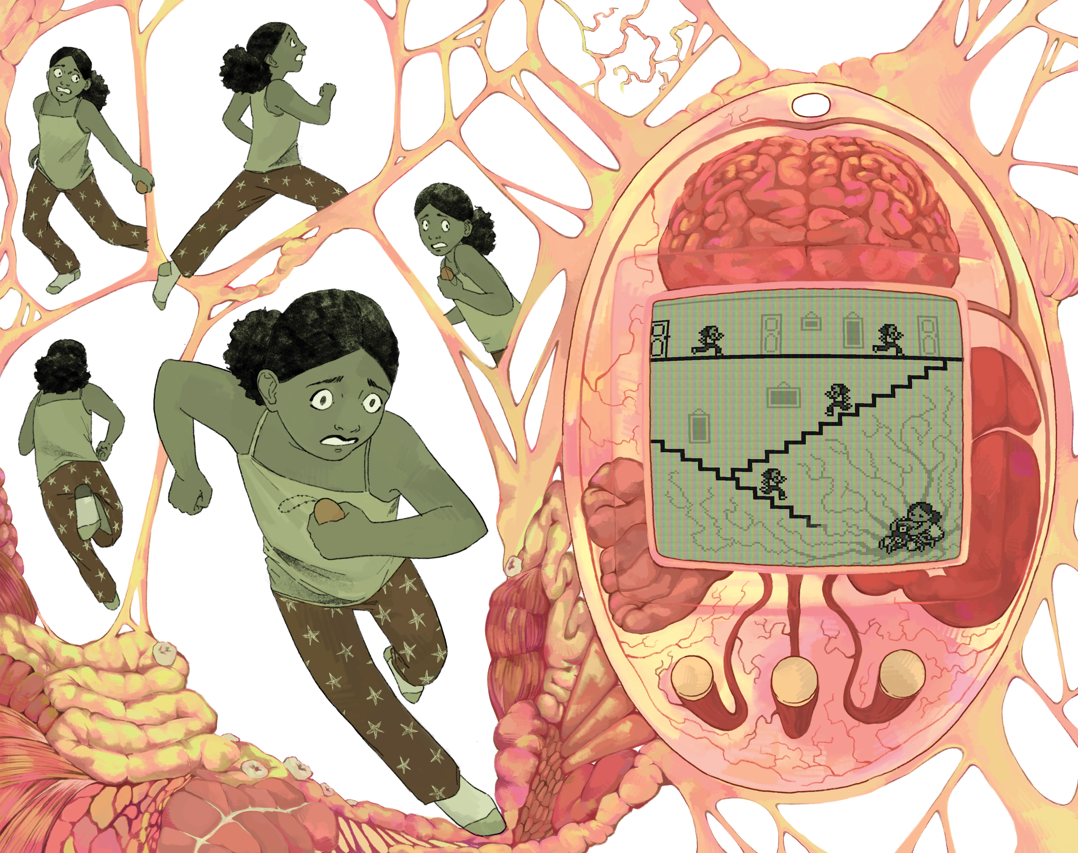A comic where a young girl gets consumed by the thoughts of taking the best care of her tamagotchi.